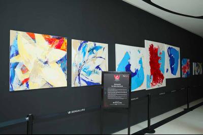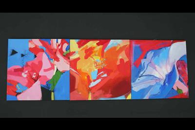 Nele Martens&rsquo abstract works interpret Air, Water, Earth, and Fire through expressive colour and form. Each piece reflects movement and transformation.