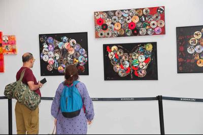 Gita Hudson transforms discarded DVDs into reflective artworks, drawing from vintage cinema culture. Her use of mirrored surfaces creates a dialogue between memory, media, and contemporary identity.
